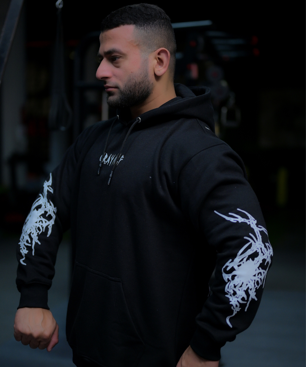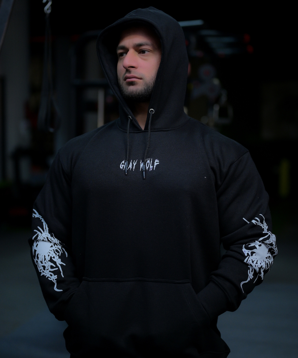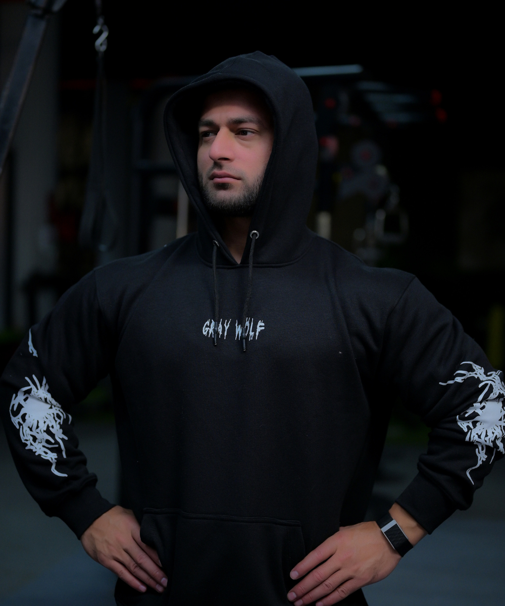 Crafted from 350 GSM, 100% cotton, the Shadowfang offers a heavyweight, structured feel with the perfect balance of comfort and durability. The bold sleeve and back artwork mirrors the raw anatomy of power, while the minimalist “Gray Wolf” chest branding keeps it grounded in authenticity. Whether you’re in the gym or out in the world, this hoodie makes a statement: silent power needs no introduction.