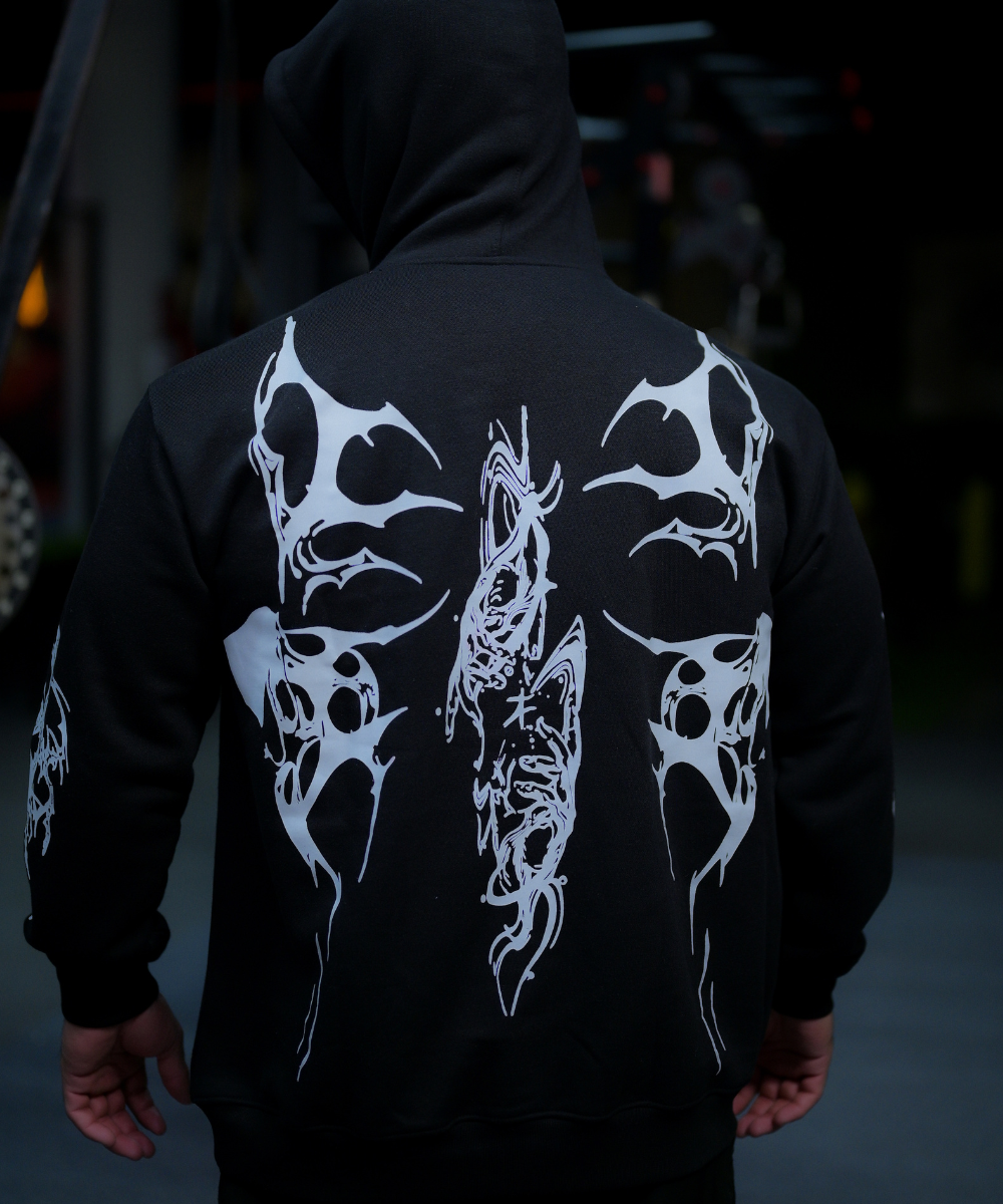 Unleash your inner predator. The Shadowfang Hoodie embodies controlled aggression, built for athletes and lifters who move through the world with quiet dominance. Designed in jet black and detailed with white, tribal-inspired graphics, this piece reflects strength, instinct, and individuality — a symbol of the wolf within.