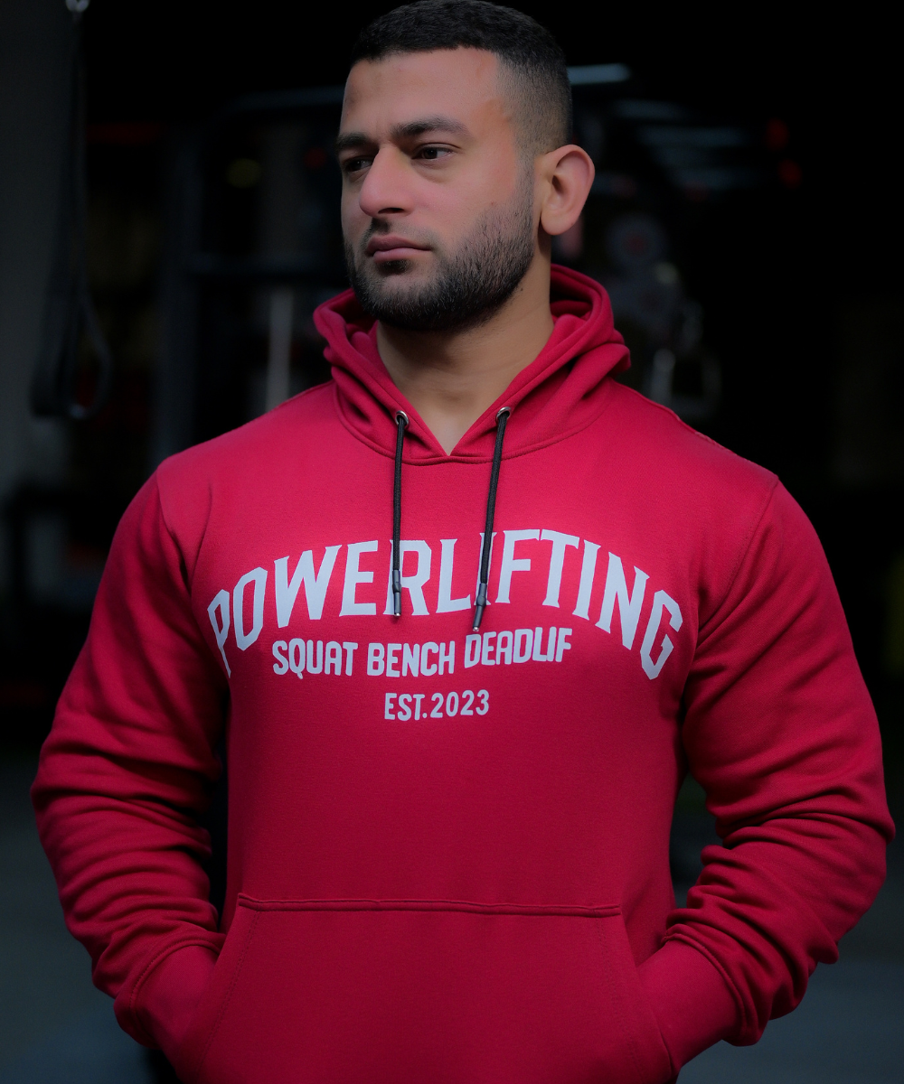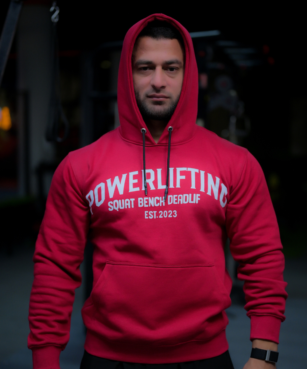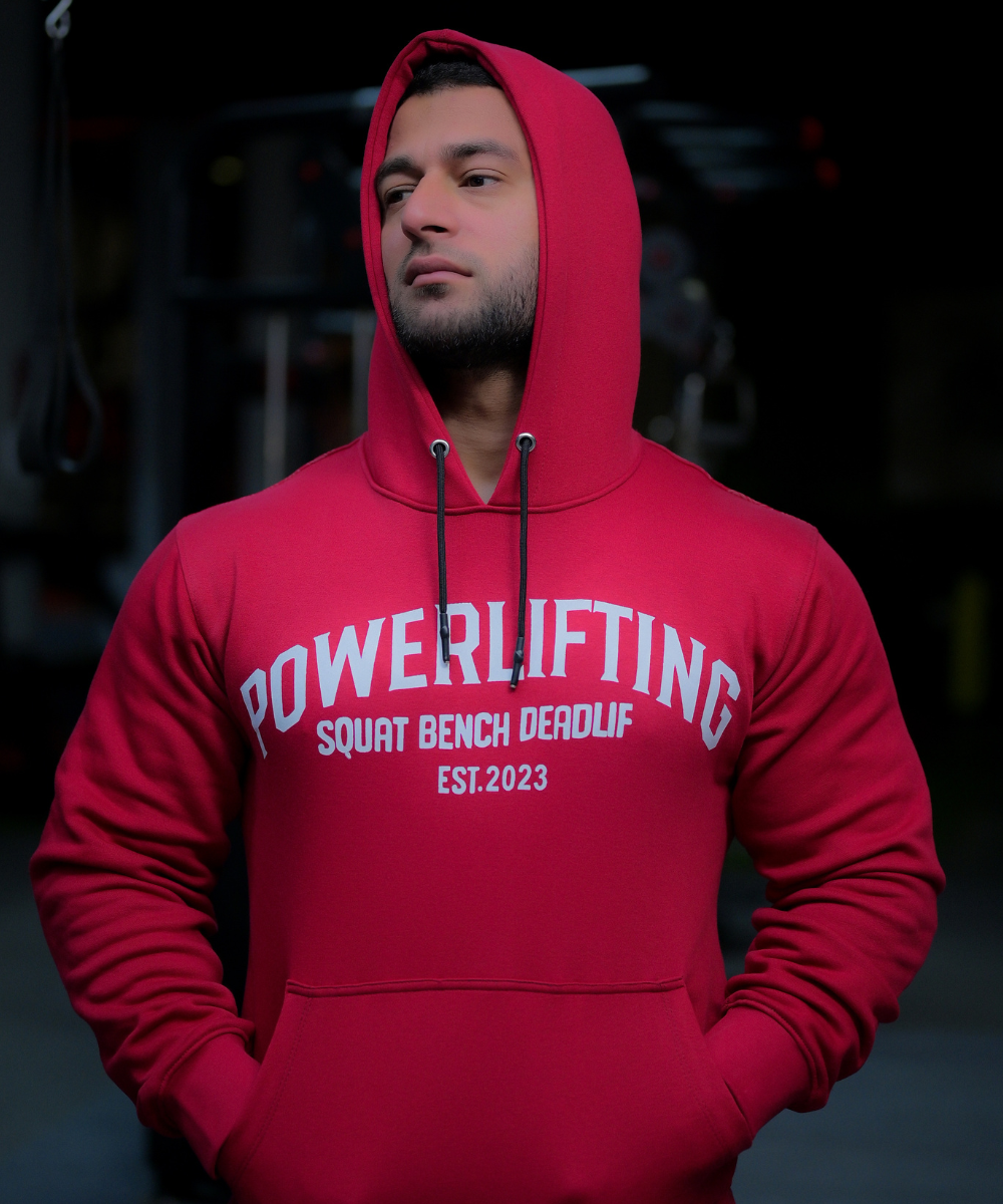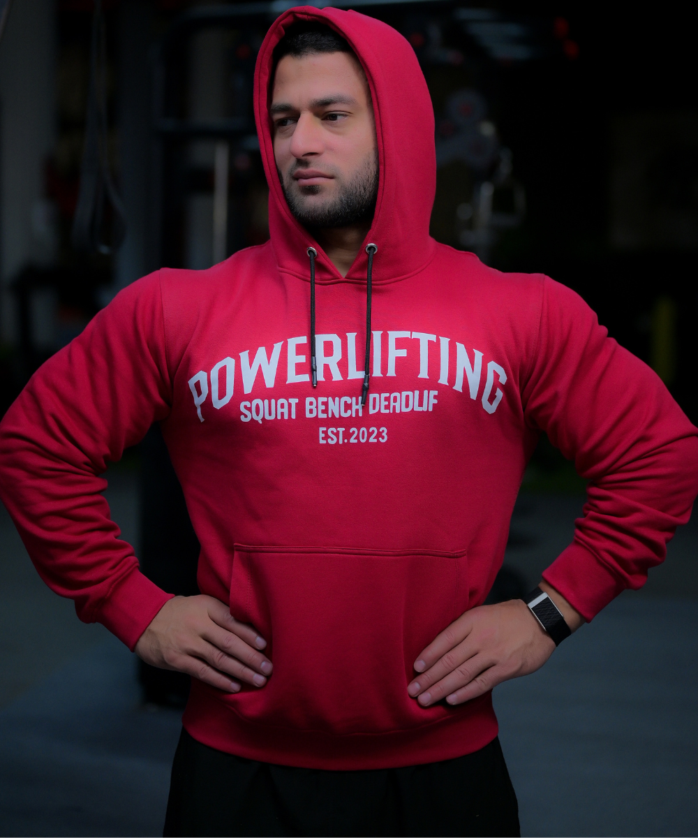 The bold collegiate “POWERLIFTING” front graphic pays tribute to the iron community, while the functional hexagonal bar grip pattern on the back defines this hoodie as both a statement and a tool. This is not just apparel — it’s gear for those who lift with intent.